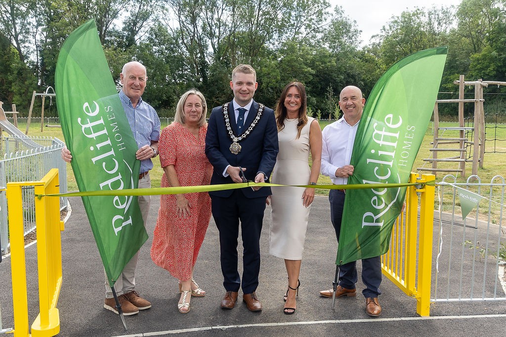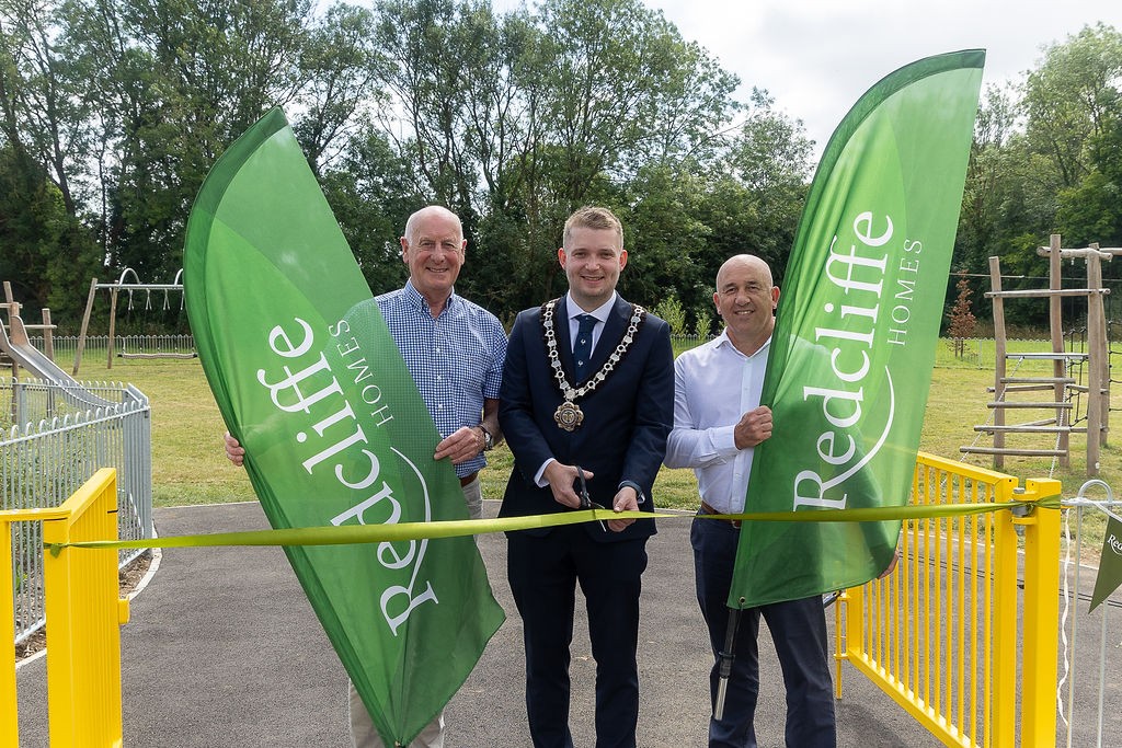 Councillor Conor Melvin cut the ribbon at the official opening ceremony of the play area and open space of the Pudding Lane Play Area, along with Tom O’Connor, Managing Director and Jon Burcombe, Development Director of Redcliffe Homes.